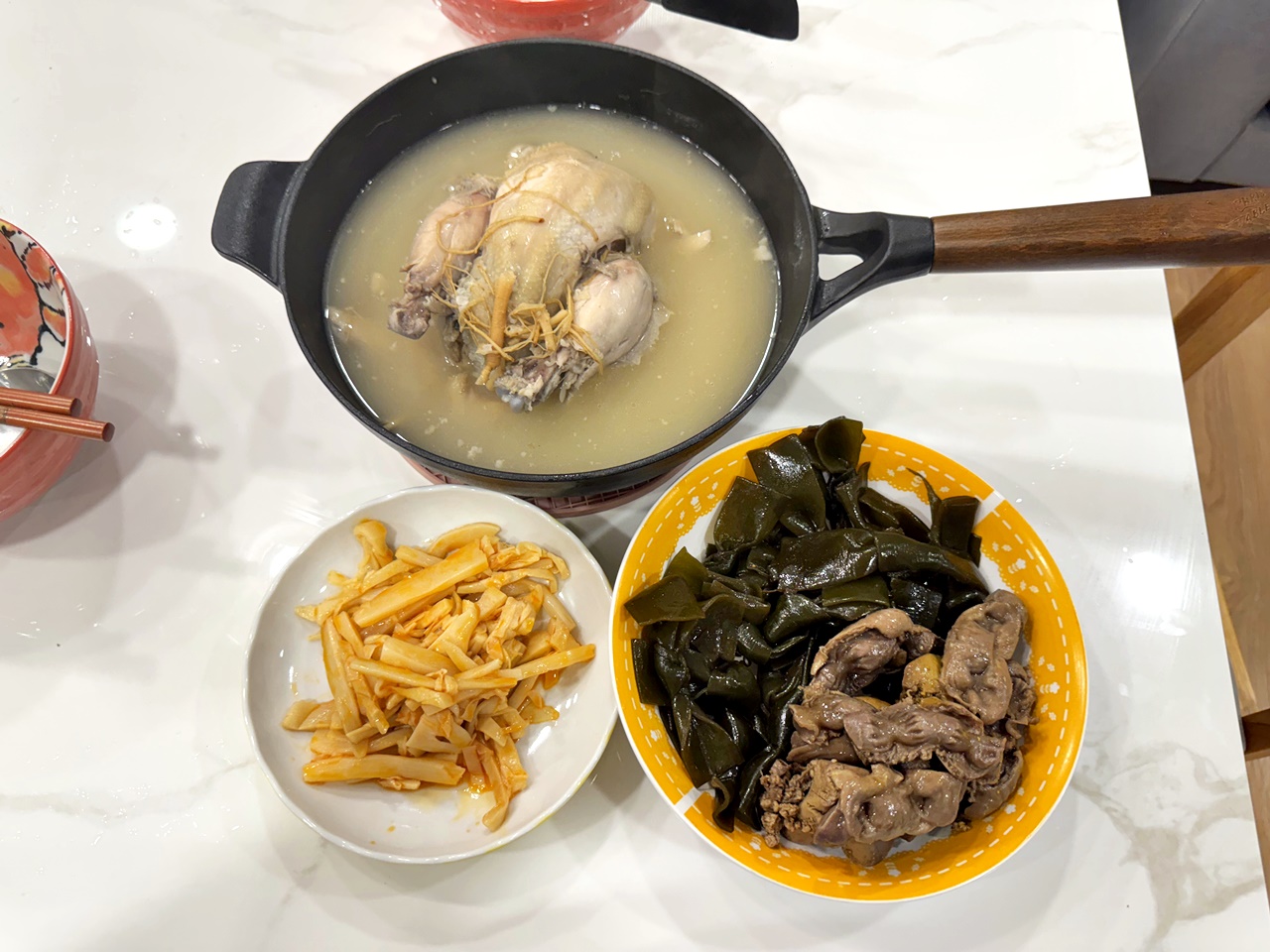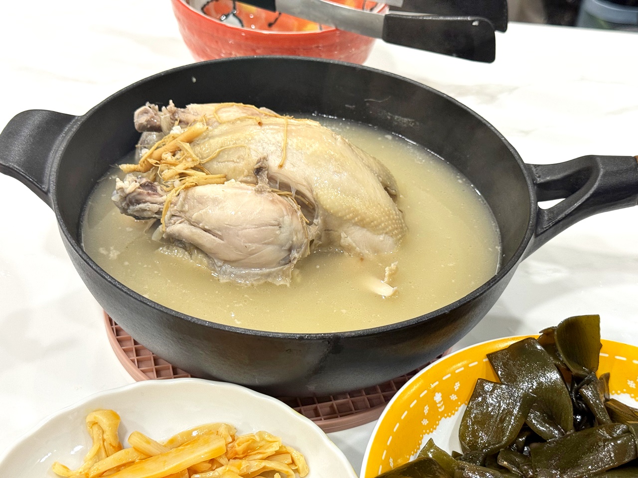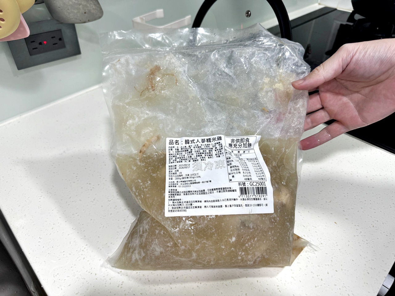 這款韓式人蔘糯米雞用的是真材實料,選的是仿土雞,裡面還放了人蔘棗子跟糯米(在雞內XD),大概15分鐘左右就熱滾滾了! 飄出來的熱氣,已經能隱約聞到淡淡的人蔘香味,那種溫暖又帶點藥膳的香氣慢慢散開,整個廚房變得很有進補的感覺(?)