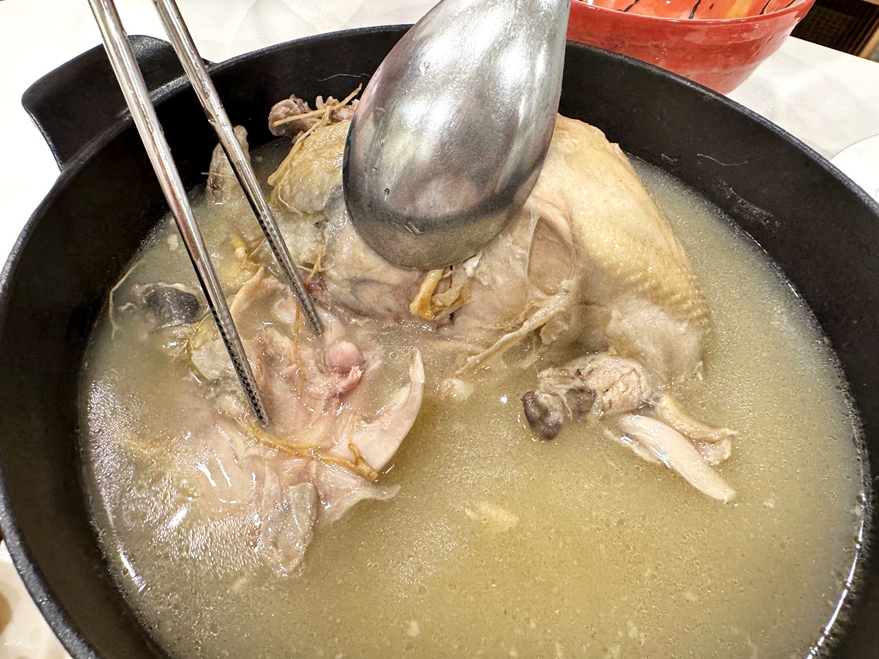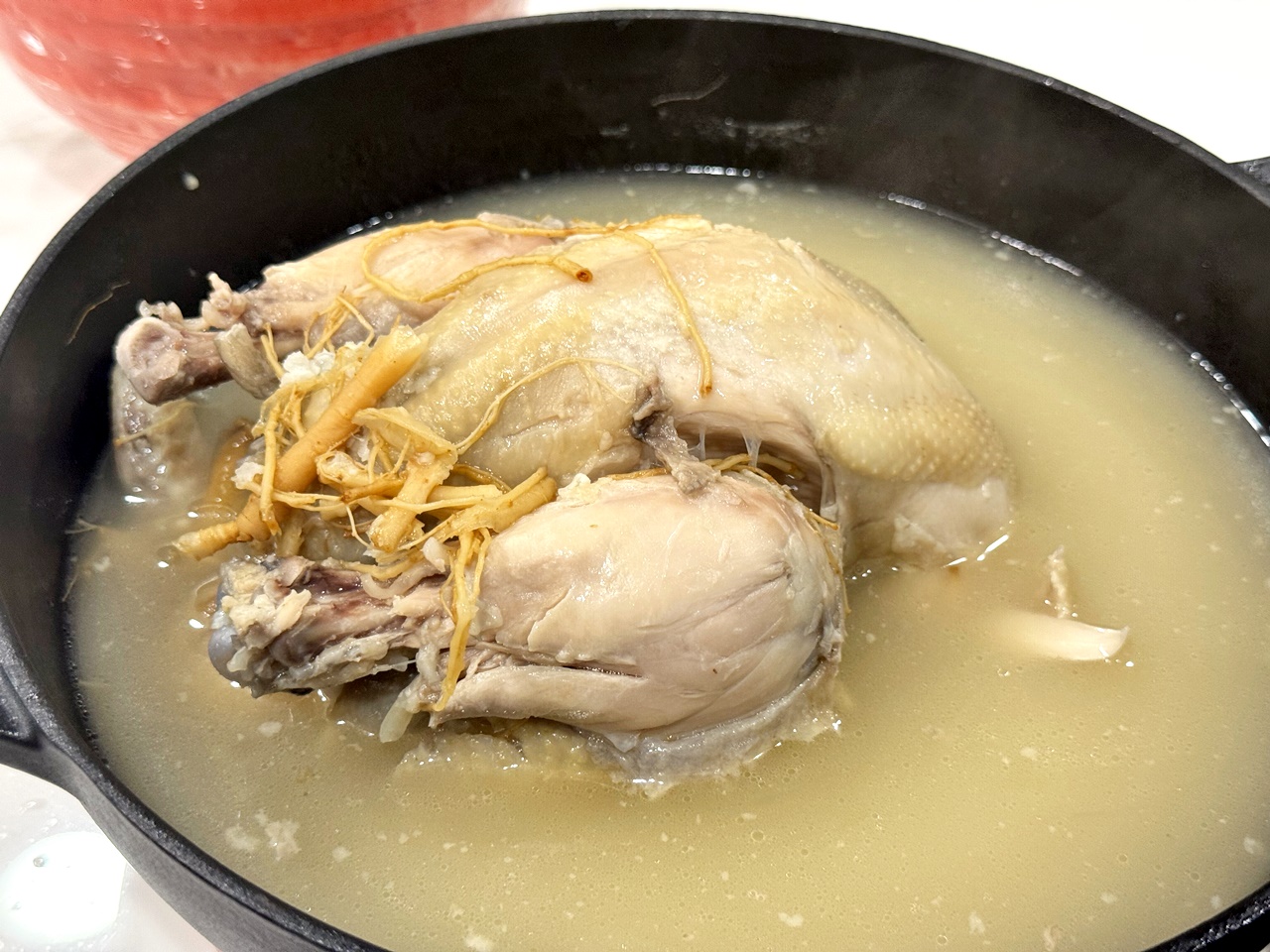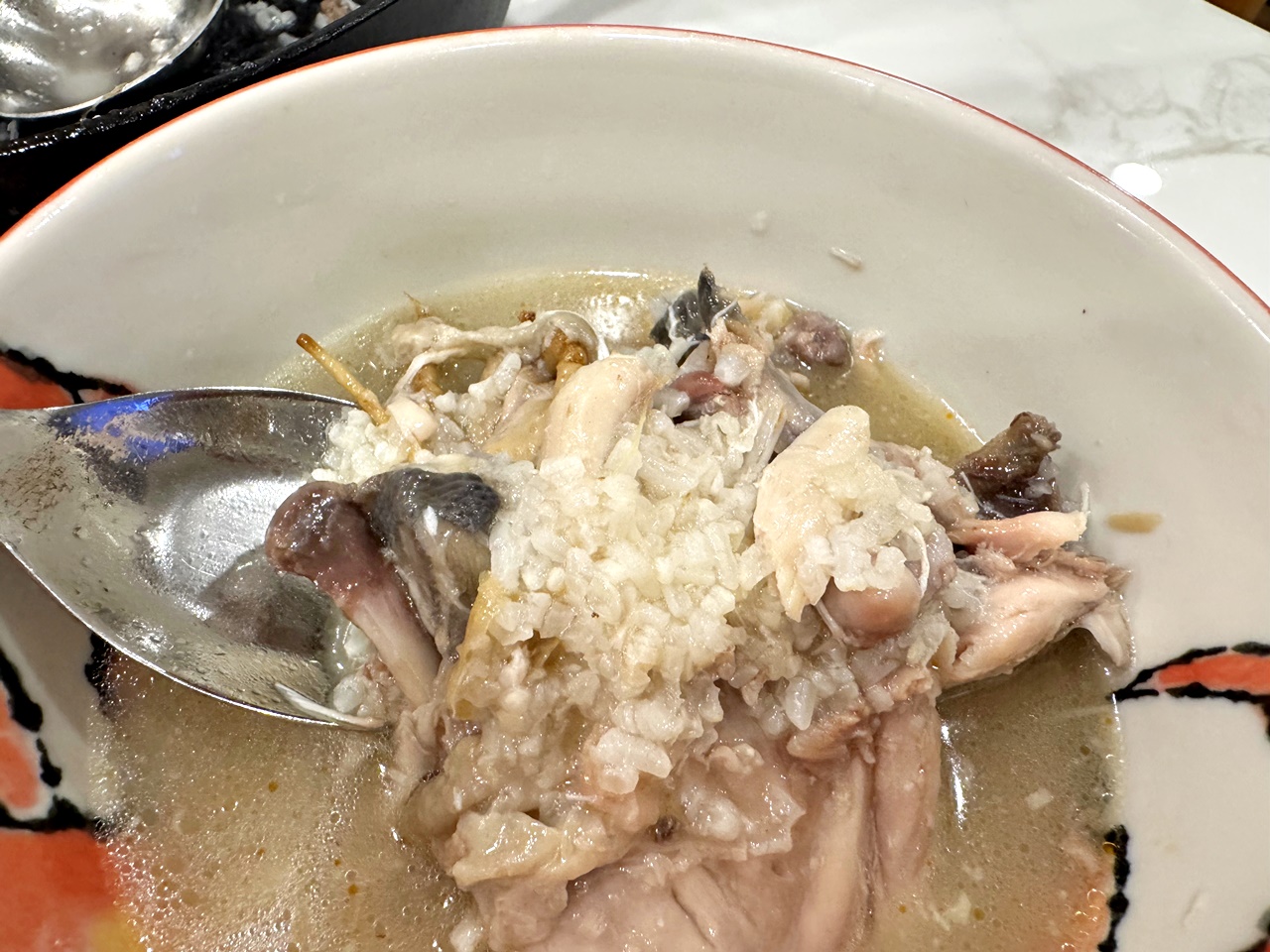 湯頭是那種自然乳白、喝起來清香不厚重,怕太重的藥材味的人可以放心,真的如官網說明的,整隻雞用小火慢慢燉超過四個小時,雞肉的鮮甜跟人蔘熬出的精華都在湯內了!非常的溫潤~~!
