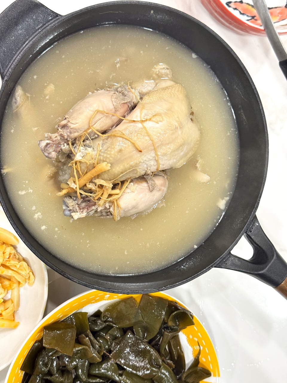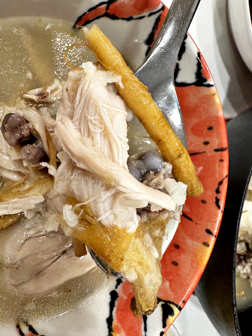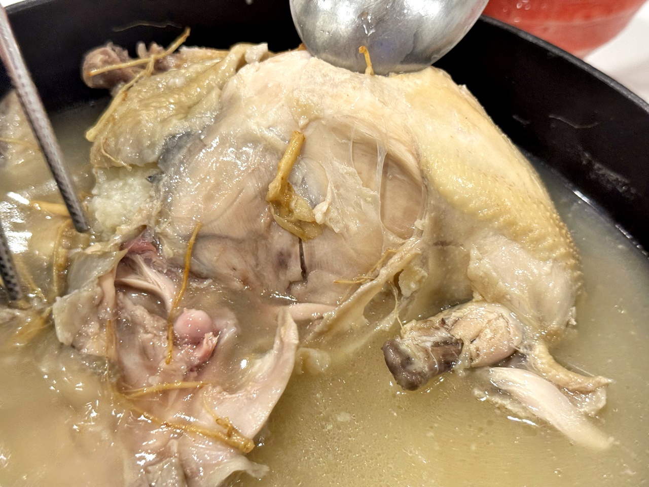 湯頭是那種自然乳白、喝起來清香不厚重,怕太重的藥材味的人可以放心,真的如官網說明的,整隻雞用小火慢慢燉超過四個小時,雞肉的鮮甜跟人蔘熬出的精華都在湯內了!非常的溫潤~~!